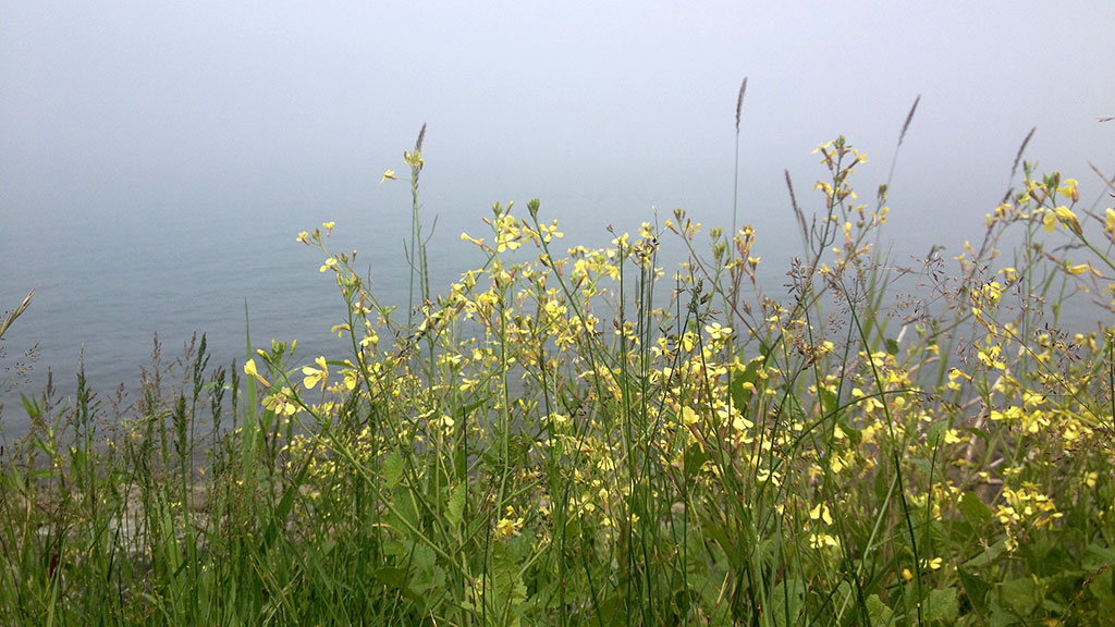 Carolyn bolted down to the rocky beach to take photos, but missed the stark contrast of the wildflowers in bright sunlight against the vastly dense fog just a few metres away. I snap all these shots with my iPhone.